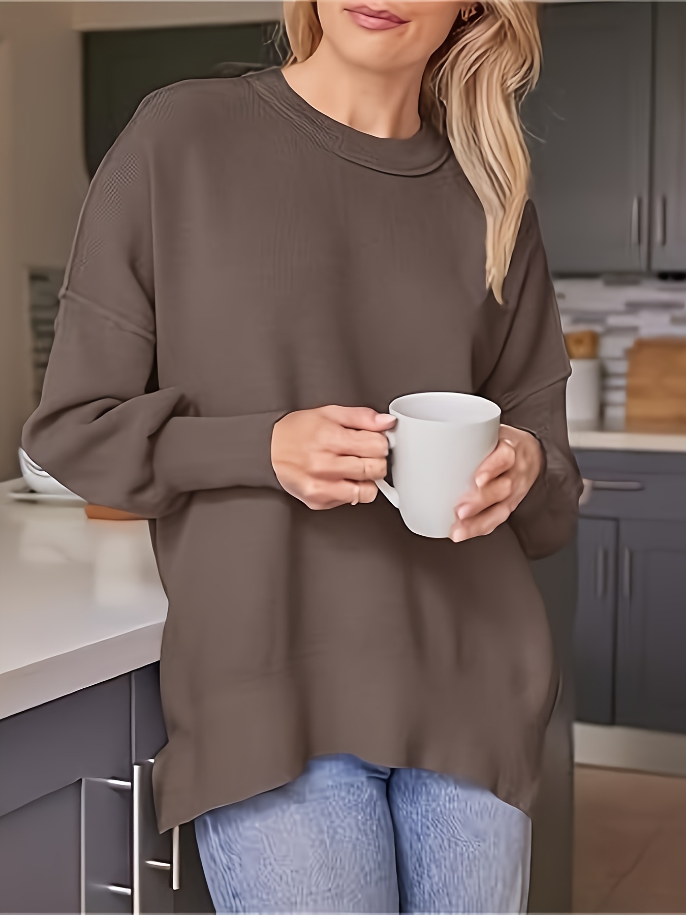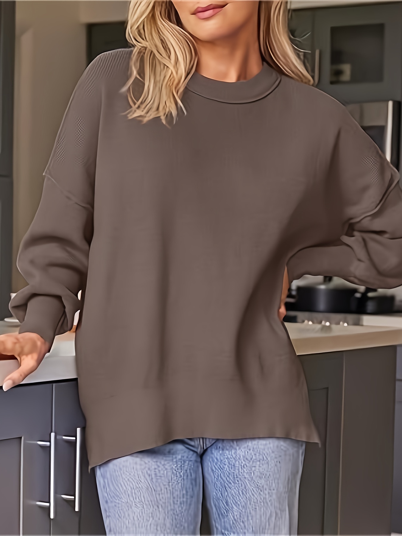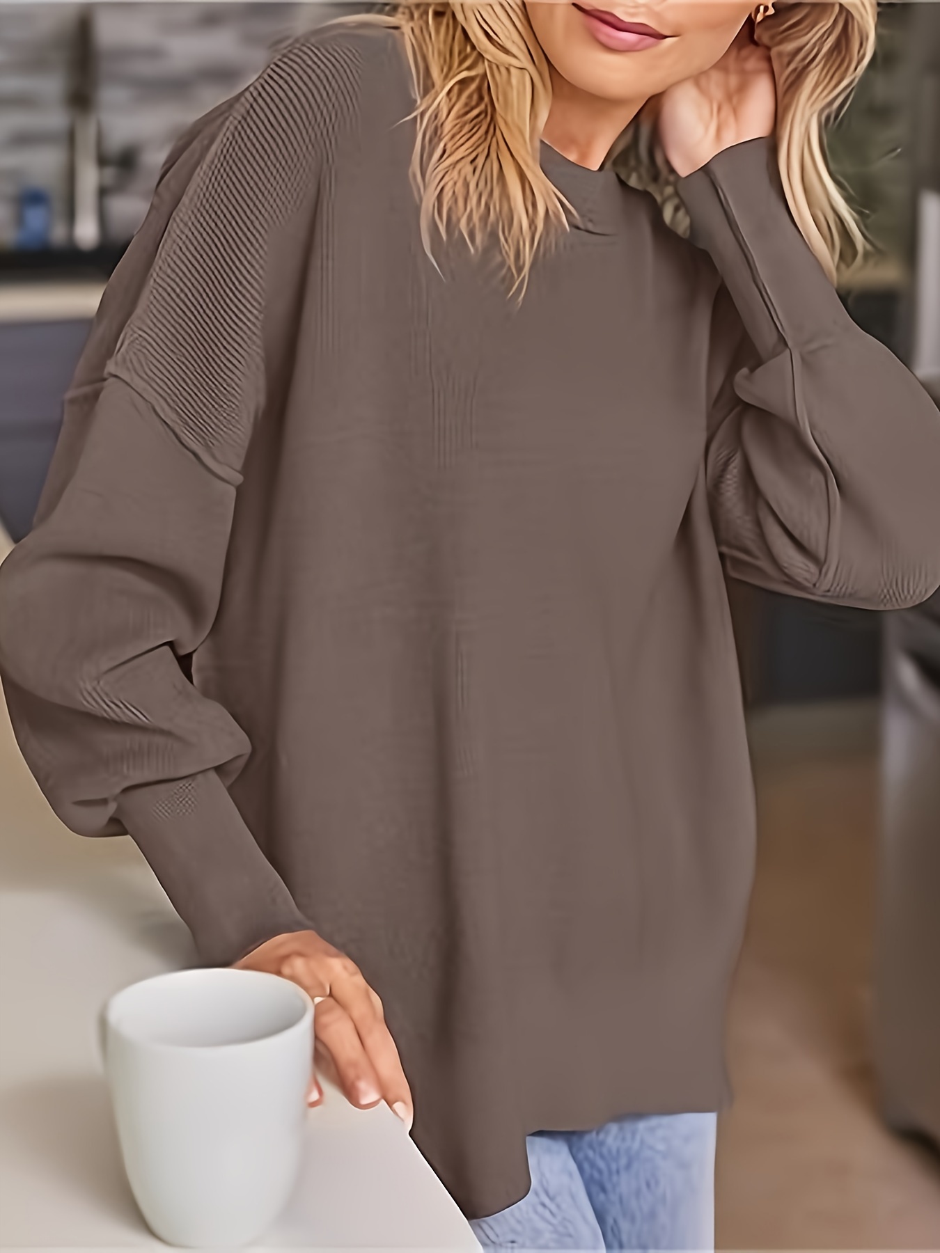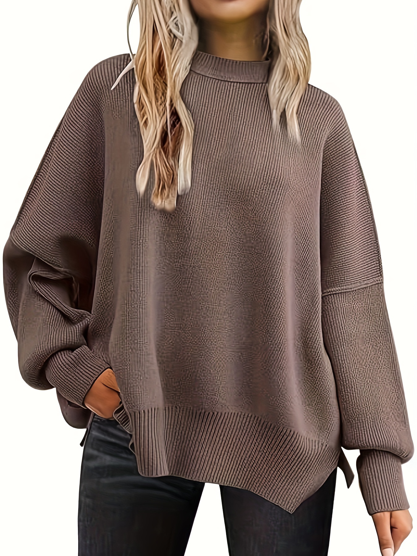 Women's Fall Winter Round Neck Batwing Long Sleeve Sweater Rib Knit Pullover Sweater