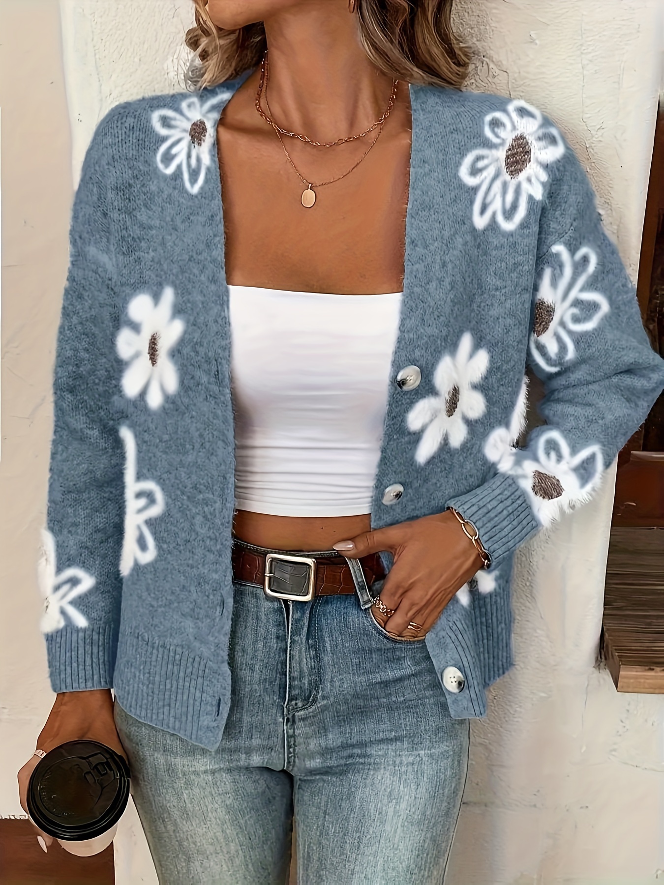 Women's Floral Pattern Button Front Knitted Cardigan, Elegant V-neck Long Sleeve Sweater